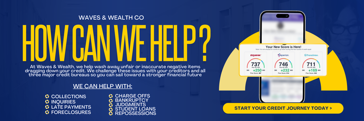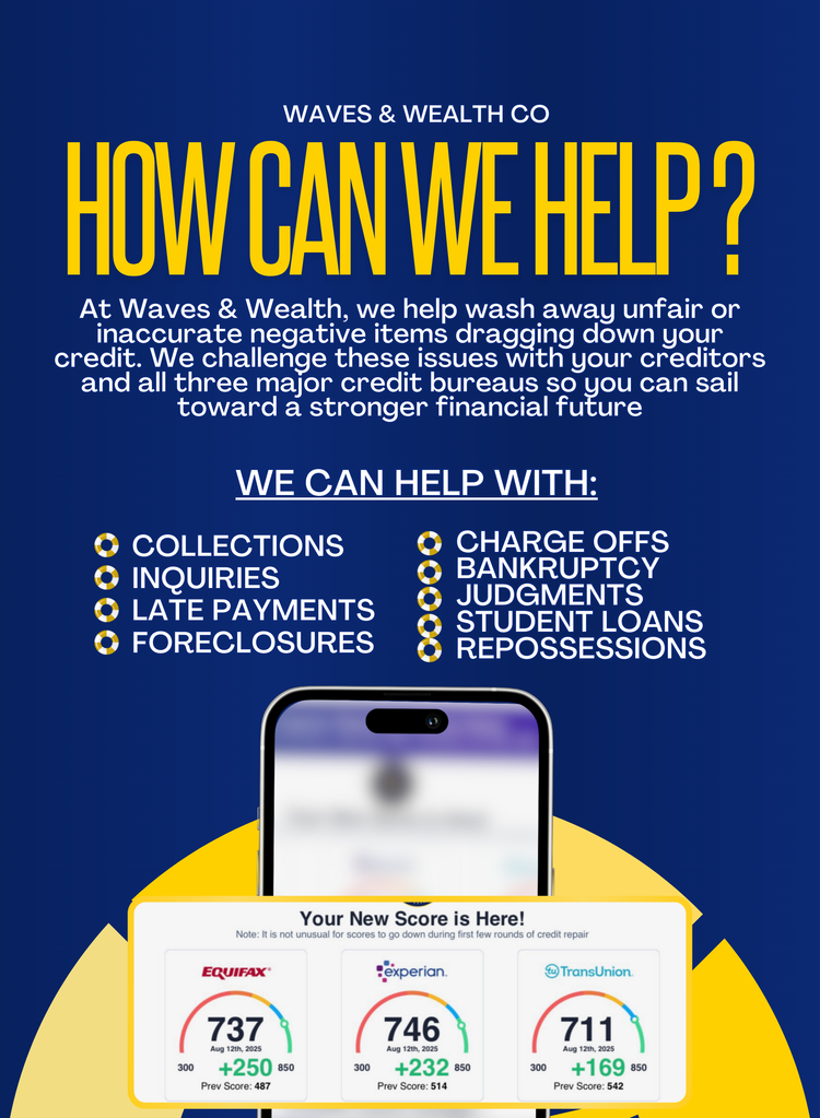 At Waves & Wealth, we help wash away unfair or inaccurate negative items dragging down your credit. We challenge these issues with your creditors and all three major credit bureaus so you can sail toward a stronger financial future. We can help with: 🛟 Collections 🛟 Inquiries 🛟 Late Payments 🛟 Foreclosures 🛟 Charge Offs 🛟 Bankruptcy 🛟 Judgments 🛟 Student Loans 🛟 Repossessions 🛟 Liens