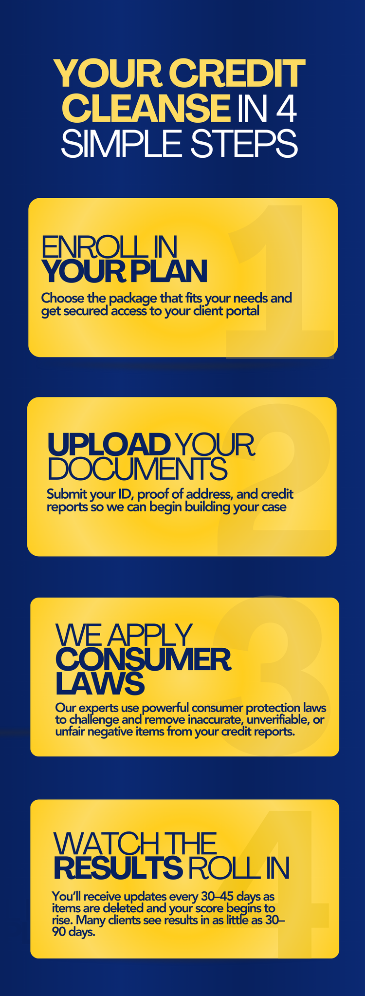 Every credit profile is different, but many clients start seeing changes within the first 30–45 days. The key is consistency — stay the course and the results will follow!